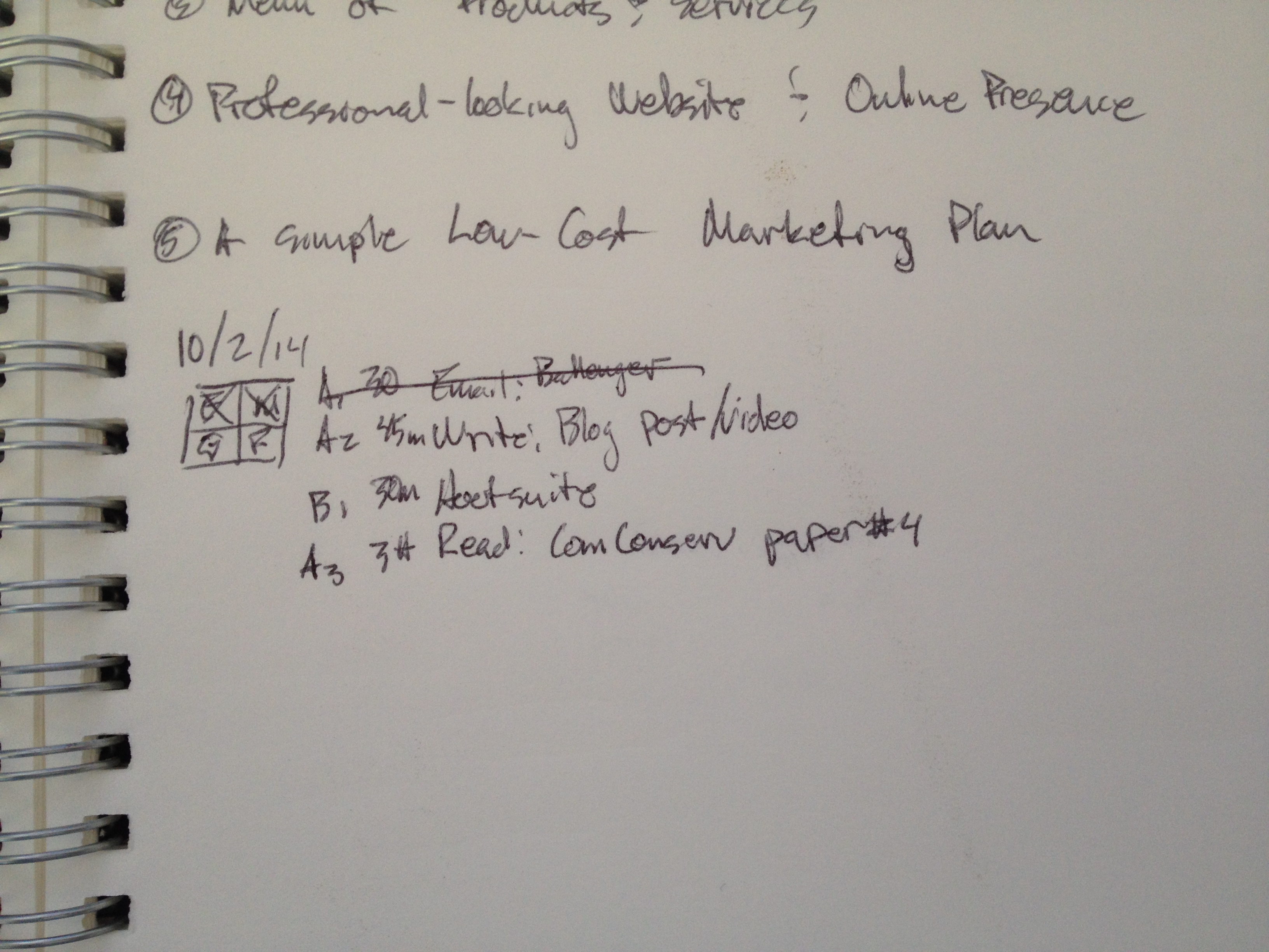 There are a bunch of digital calendars and Microsoft Office-esque scheduling programs you can use, but those systems require you to take the time to actually log on and check them out. This may or may not happen. I use a whiteboard or notebook because these media are readily available and can be glanced at in a moment’s notice.
