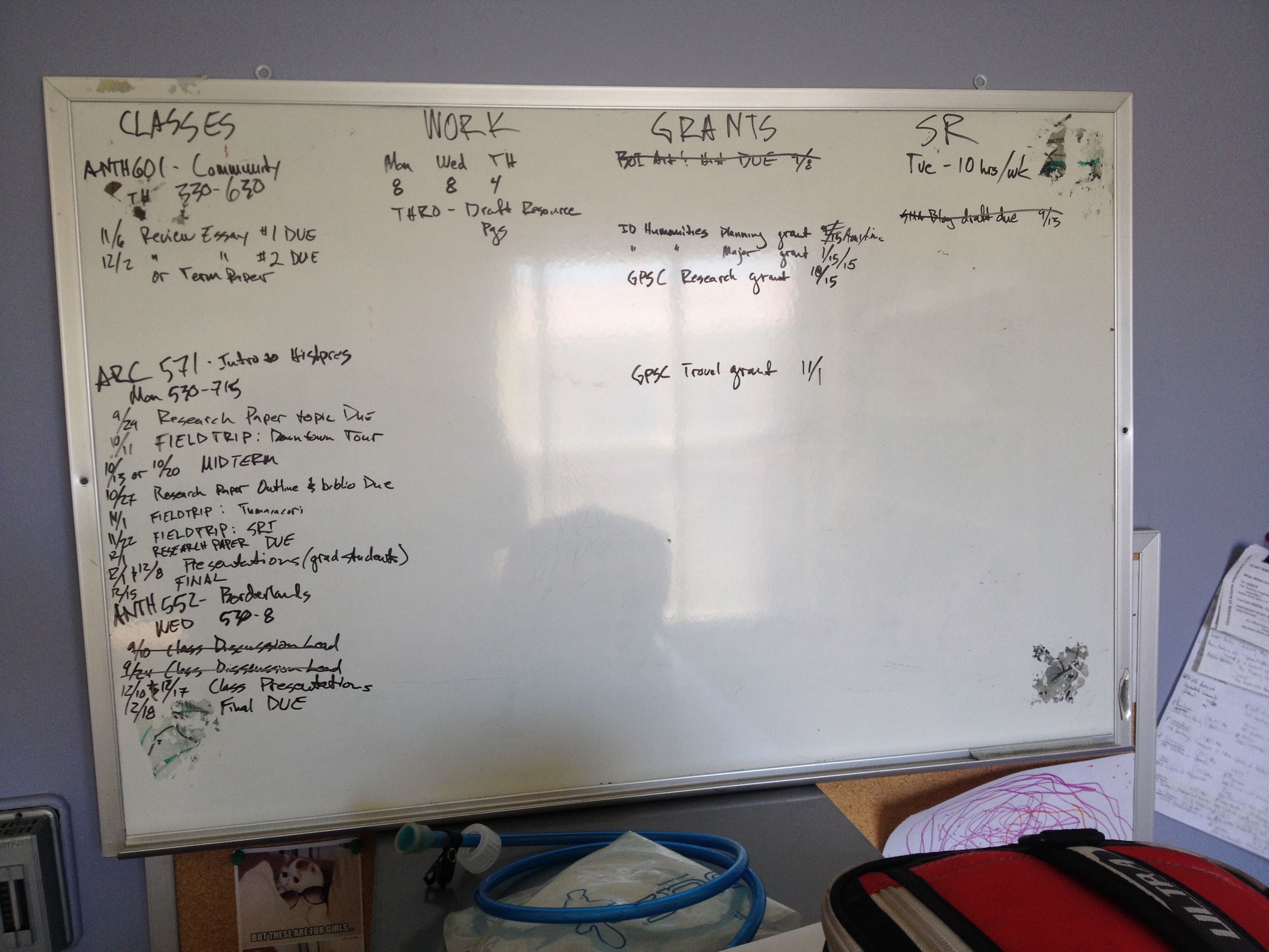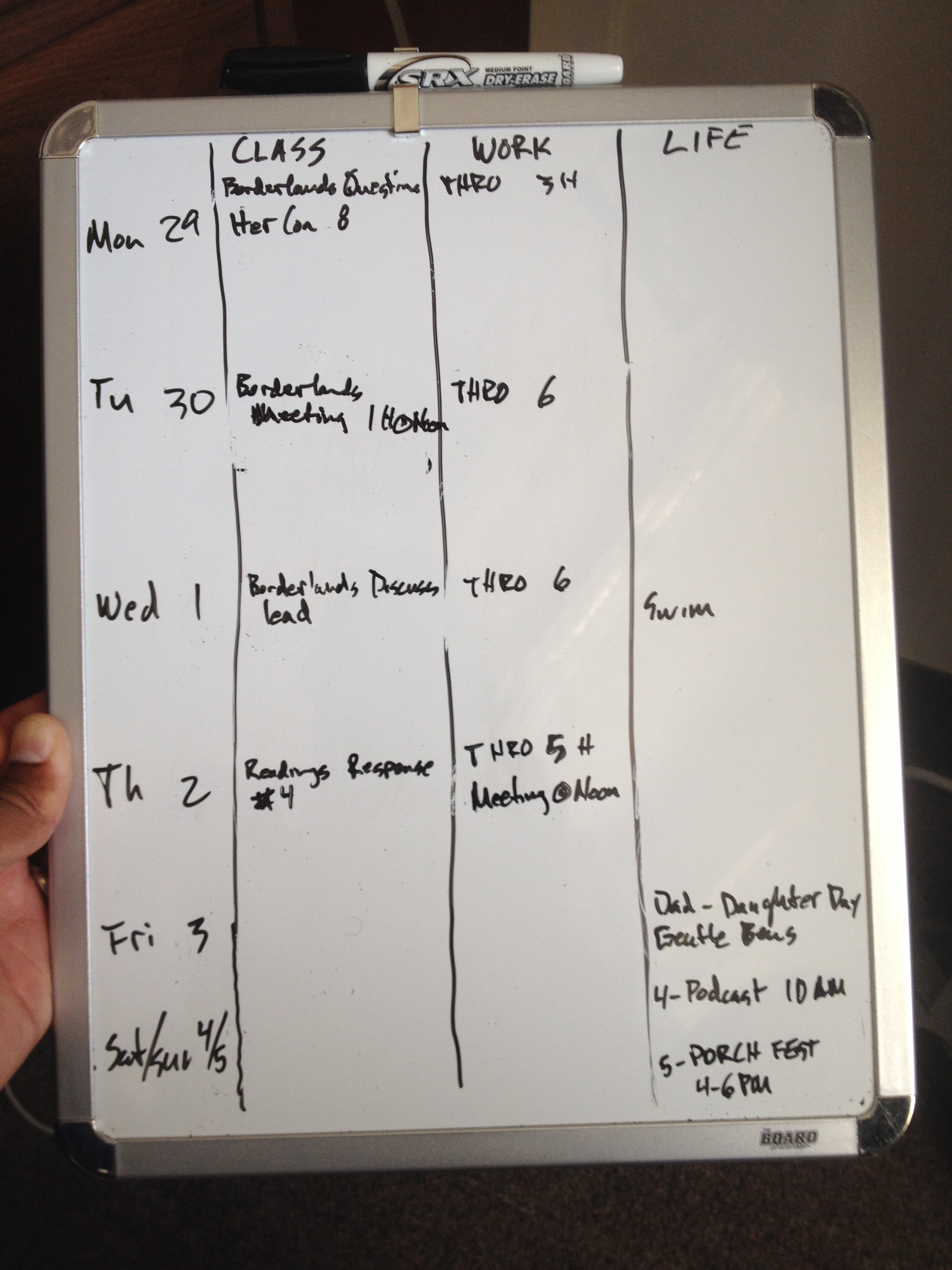 Medium Range Task List: Most of us have a number of different tasks to accomplish each week. Even though I maintain a long range calendar, I operate best on a week-to-week basis because those tasks are closer to the present and are easier to remember. Once again there are a number of different systems for keeping track of weekly tasks, but I prefer a low-tech white board. I keep a small whiteboard next to my computer monitor where I can easily see any upcoming meetings, assignments, and other obligations. I divide this into three columns for school, work, and life.